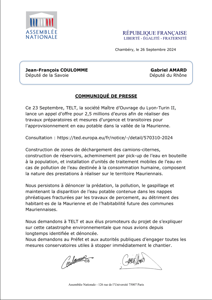 C’est d’ailleurs la société TELT elle-même qui, dès lundi 23 septembre 2024, a publié un appel d’offre pour la mise à disposition de camions-citernes connectés à des unités de distribution d’eau potable et/ou de pick-up et d’eau en bouteilles sur la zone de creusement prévue de Saint-Jean de Maurienne à la frontière italienne .