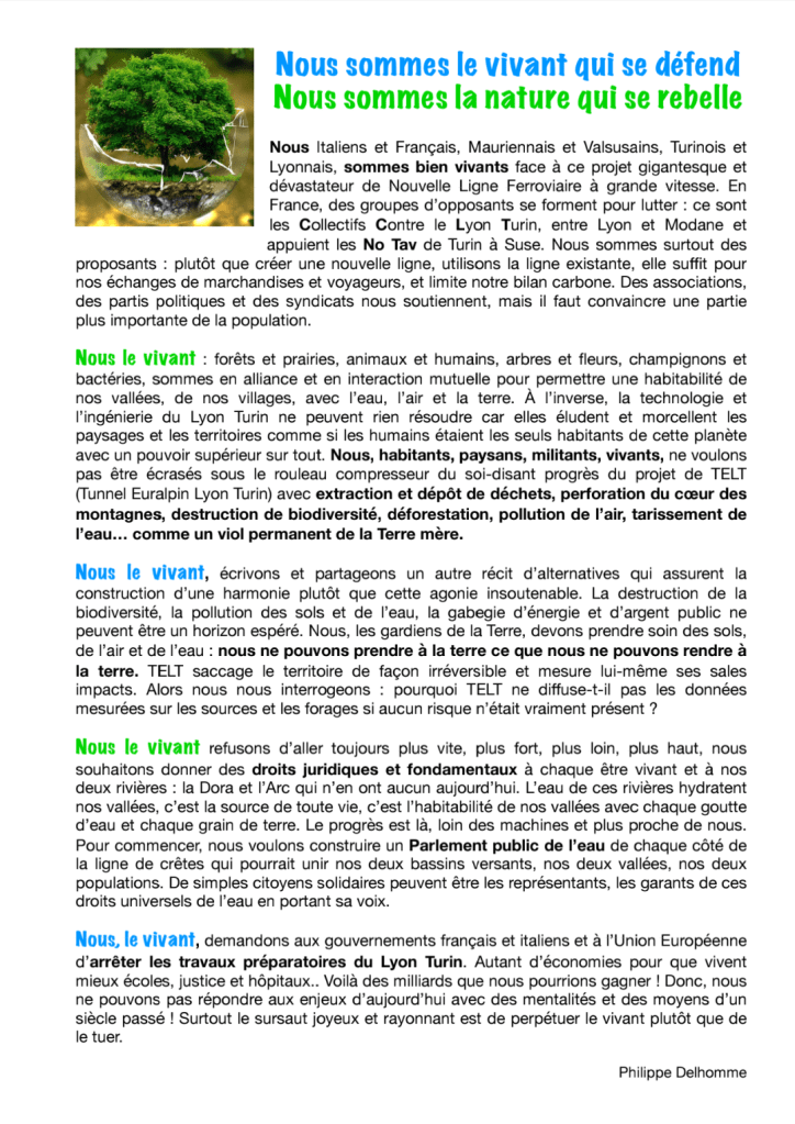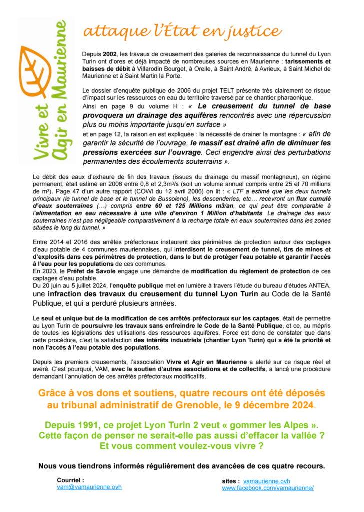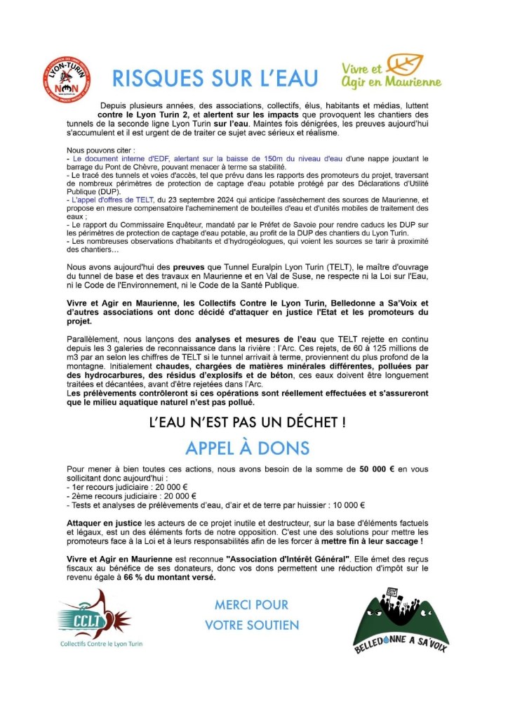 Nous appelons les élus de Maurienne, et plus généralement de Savoie et de la région AURA, à respecter et faire respecter les dispositions de la Charte de l’environnement et le « devoir de prendre part à la préservation et l’amélioration de l’environnement. » et à exiger le respect de l’article 5 de cette même charte à valeur constitutionnelle : « Lorsque la réalisation d’un dommage, bien qu’incertain en l’état des connaissances scientifiques, pourrait affecter de manière grave et irréversible l’environnement, les autorités publiques veillent, par application du principe de précaution et dans leurs domaines d’attributions, à la mise en œuvre de procédures d’évaluation des risques et à l’adoption de mesures provisoires et proportionnées afin de parer à la réalisation du dommage. »