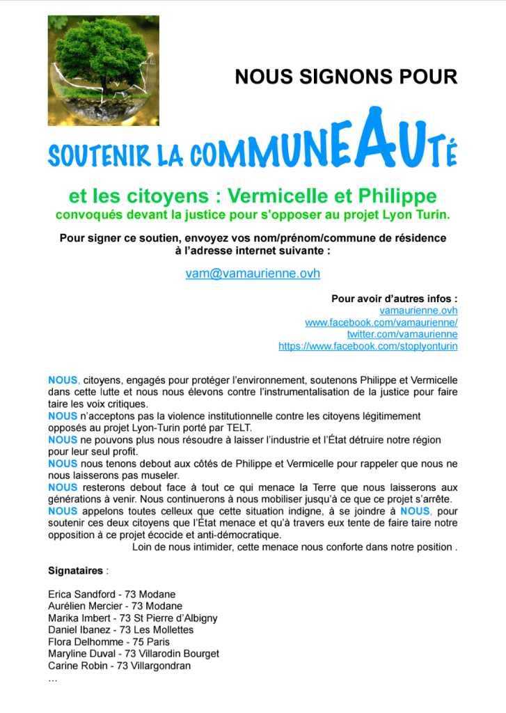 Vivre et Agir en Maurienne (VAM), Les Collectifs contre le Lyon Turin, Belledonne A Sa’Voix et plusieurs autres associations.